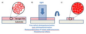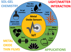 Figure 1. Schematic view of the process that we will develop involving preparation of metal oxide precursors solutions, thin films and curing by laser. Targeted applications are metal oxide sensors prepared at room temperature on various substrates such as glass, plastics, nanocomposites, textiles. Low-cost, versatile integration process makes it possible to develop new applications in the field of Internet of Things (IoT).